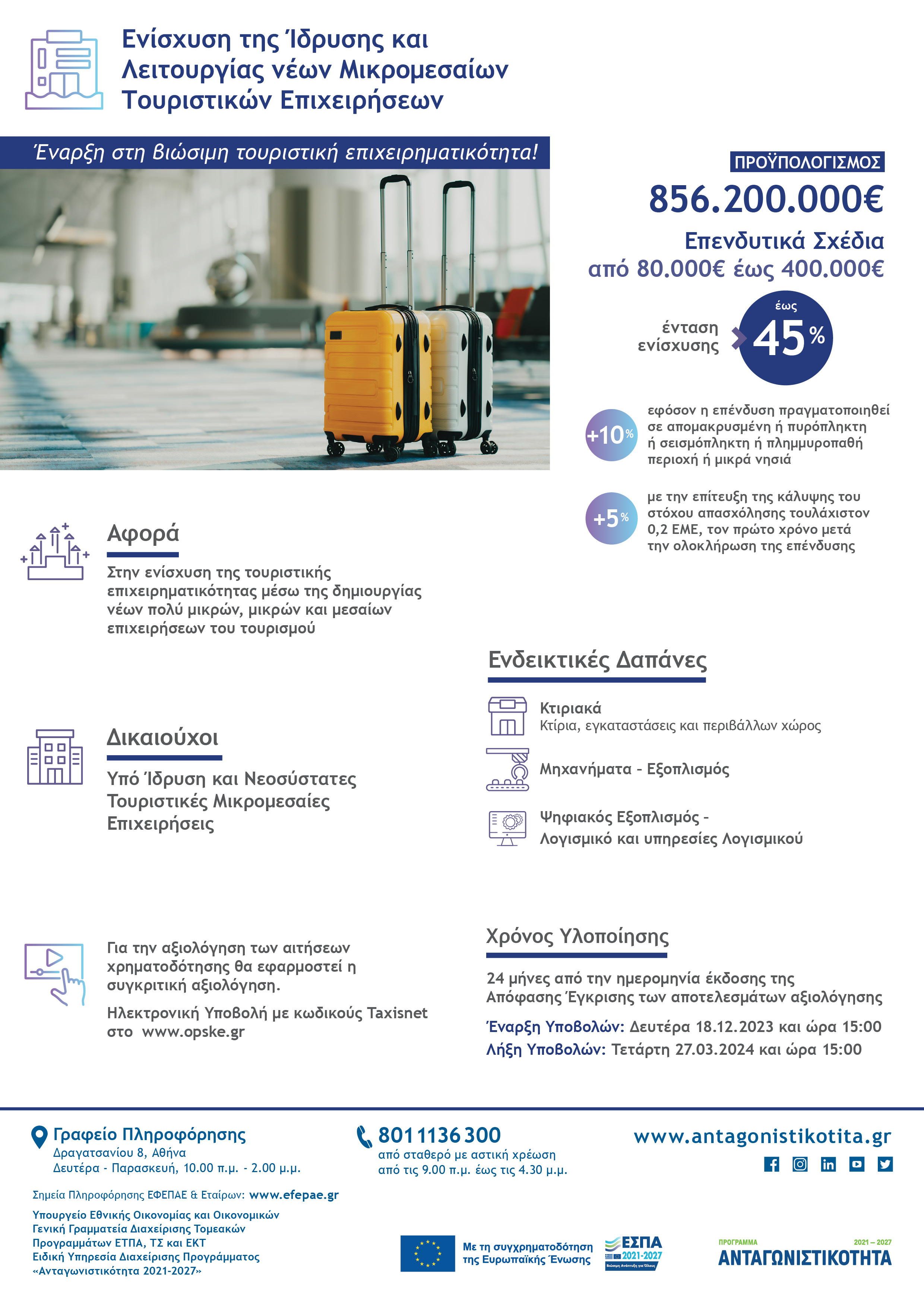 Ελάχιστος / μέγιστος επιχορηγούμενος προϋπολογισμός επενδυτικών σχεδίων: 80.000€ έως και 400.000€.